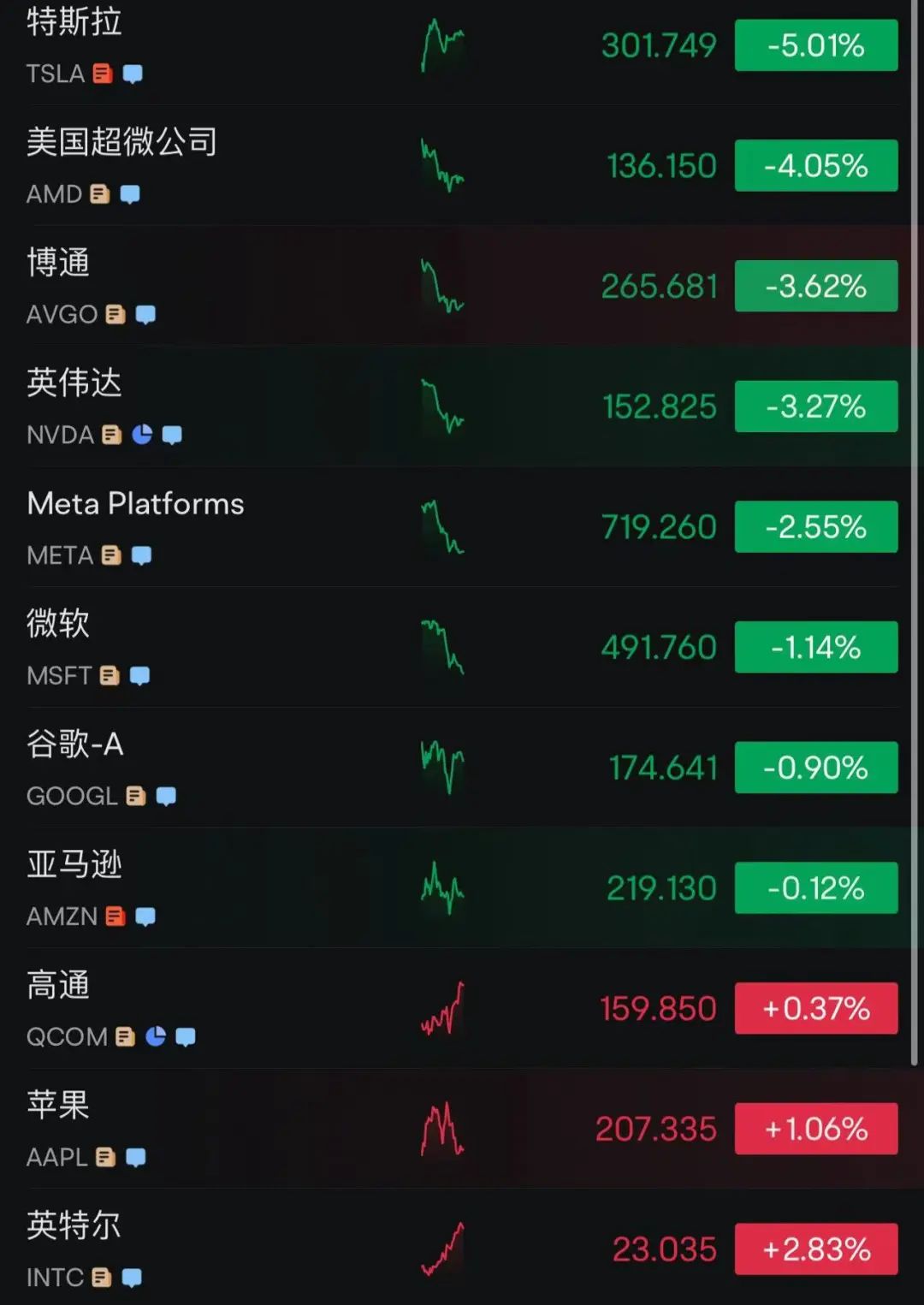 好意思国科技巨头除苹果、英特尔、高通外均出现着落。其中,英伟达跌超3%,特斯拉跌超5%。