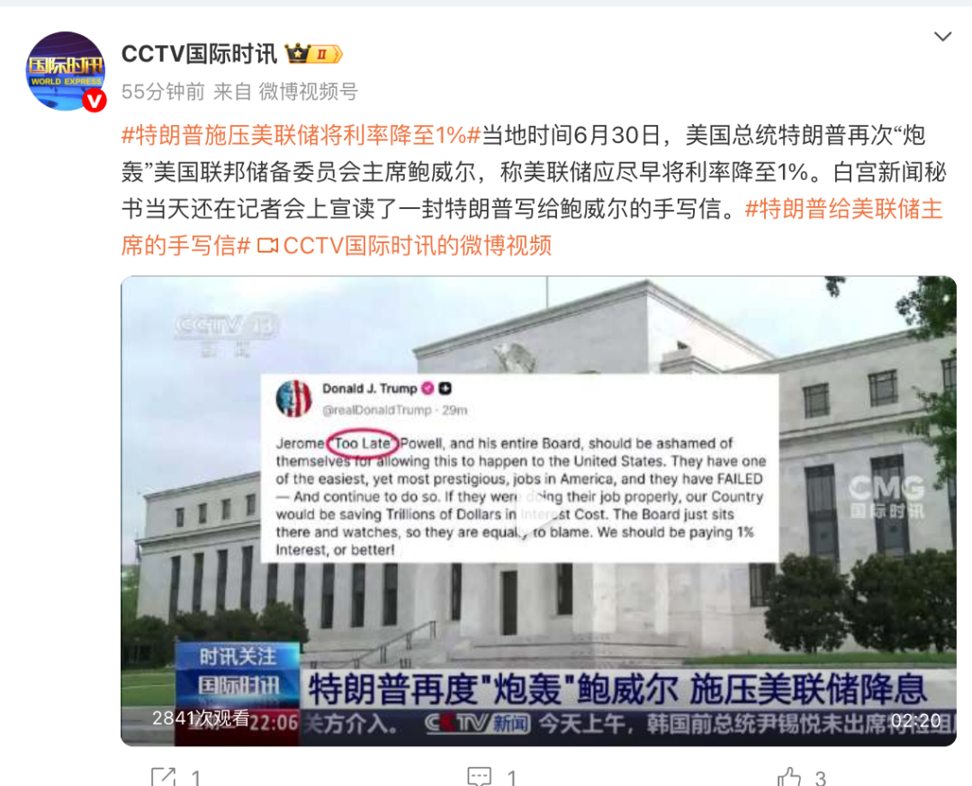 “特朗普关税导致降息推迟”!特朗普再次“炮轰”鲍威尔:好意思联储应尽早将利率降至1%