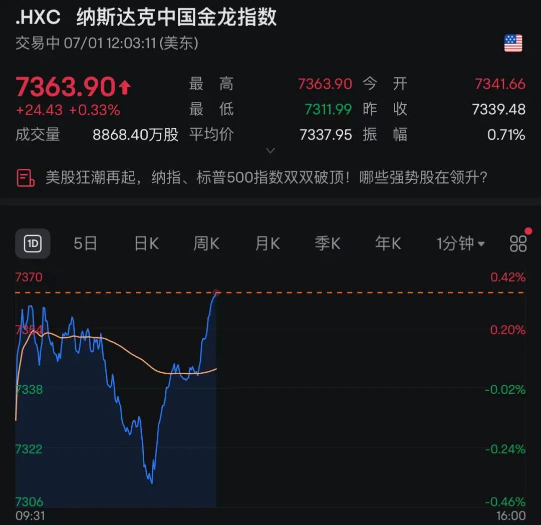 纳斯达克中国金龙指数走出“深V”,截止发稿,由跌转涨,涨幅为0.33%。